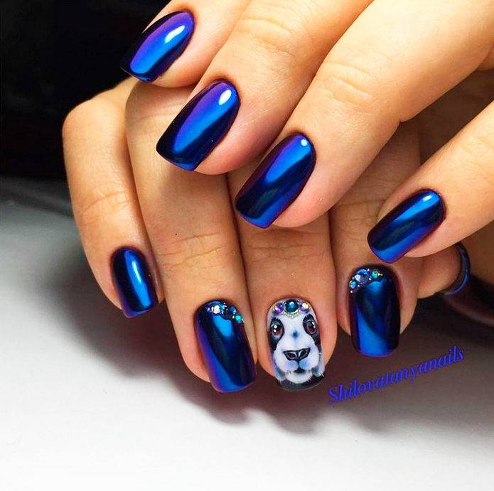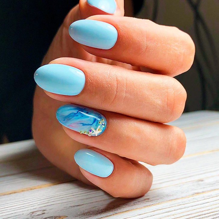 2. Синий маникюр сам по себе очень активный, поэтому перегружать его элементами дизайна не всегда оправданно. По-прежнему в тренде декор на одном или нескольких пальцах, уравновешенный монохромным покрытием остальных ногтей.
