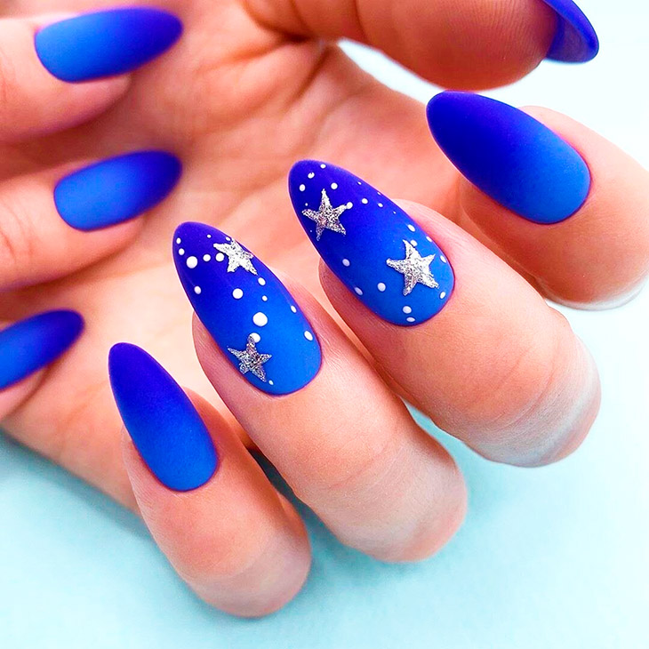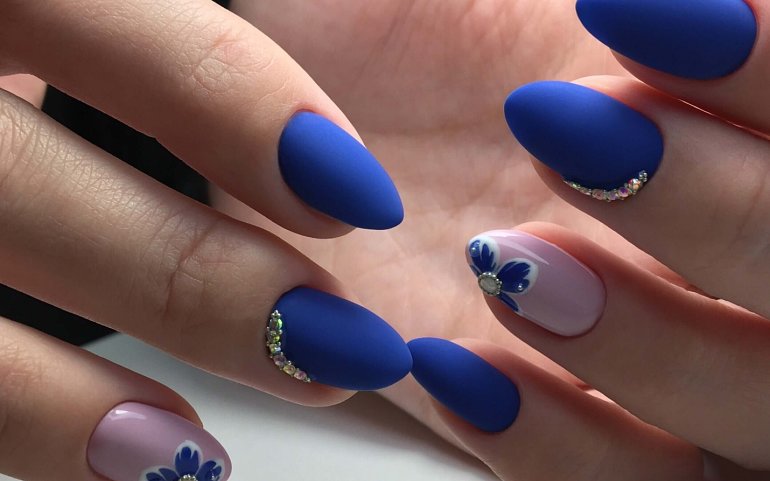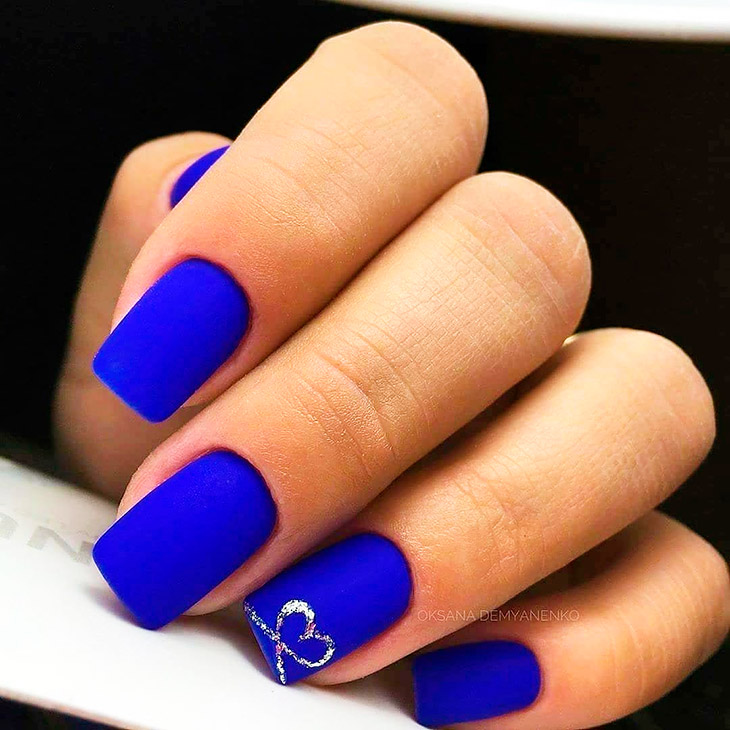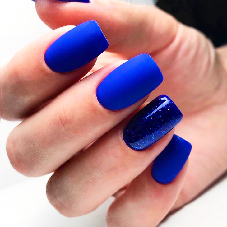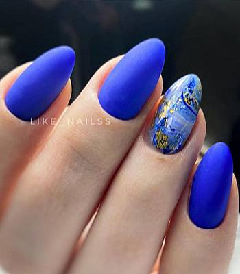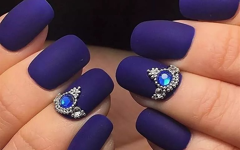 1. Матовое покрытие не сдает позиций. Эта текстура лучше всего смотрится на длинных ногтях. Матовый гель-лак темных оттенков синего выглядит сдержанно и строго, а в сочетании с глиттером, камушками или стразами — экстравагантно и стильно. Свежая идея для дизайна — использование матового и глянцевого лака одного оттенка, в результате получается сдержанный, но нестандартный маникюр.
