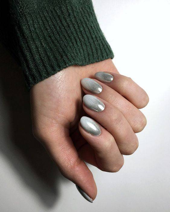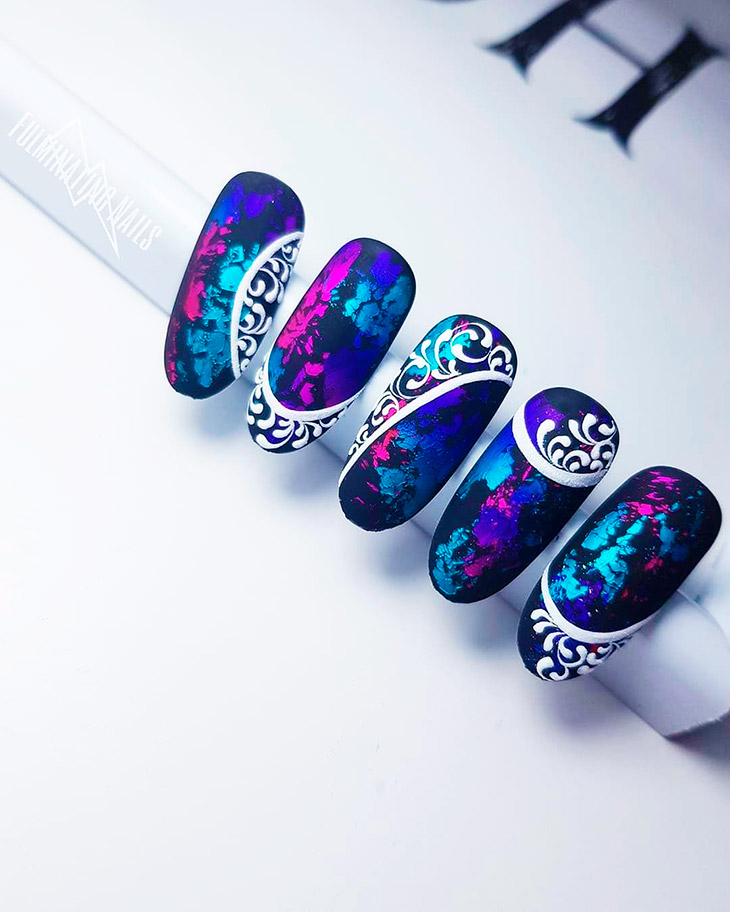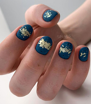Фольга. Этот материал давно опередил стразы среди любителей блестящего маникюра. Особенно эффектно смотрится серебряная и золотая фольга на фоне темных насыщенных оттенков синего. Футуристичный дизайн можно создать с использованием голографической фольги.