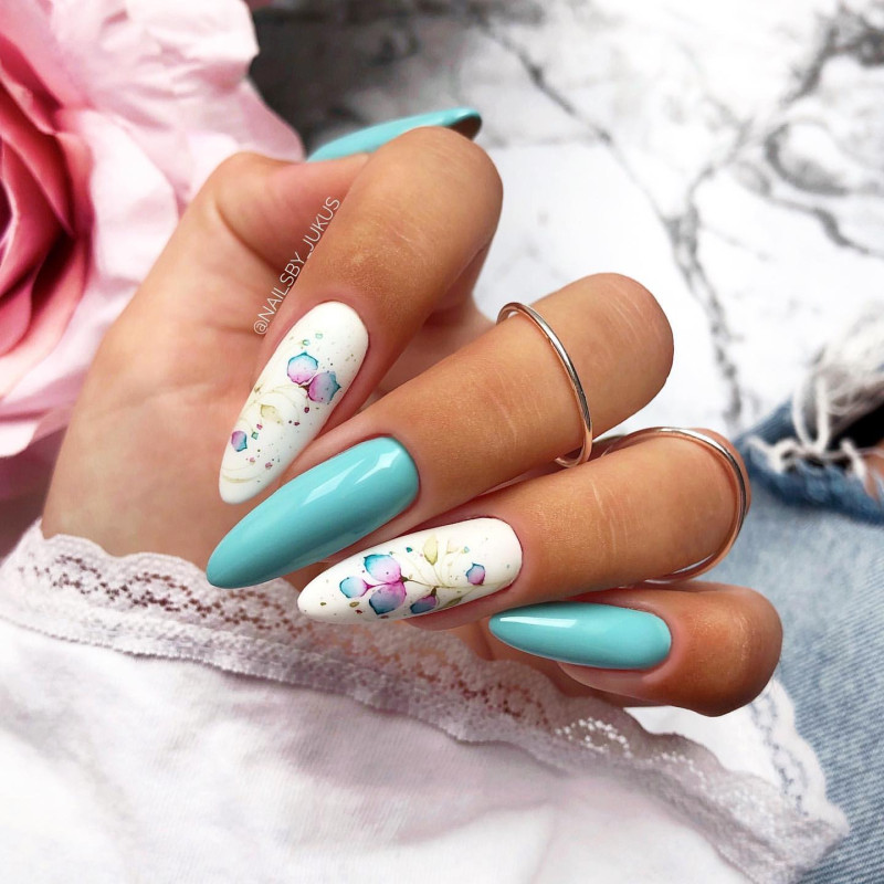 Если вы делаете маникюр самостоятельно, то освойте новую технику — цветы по мокрому. Чтобы нарисовать полупрозрачные цветы, не имея в арсенале специального гель-лака, используйте палитру, базу или топ. Капните несколько капель синего гель-лака на палетку и разбавьте двумя-тремя каплями топа, затем все перемешайте и в таком виде наносите на ногти тонкой кистью, растушевывая края лепестков.