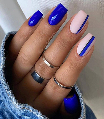 Наиболее гармоничные пары для синего в маникюре: белый, все оттенки бежевого и телесного, золотой и серебряный.
