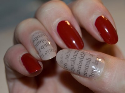 Важно помнить, что для этого маникюра подходит именно газетная бумага с типографской краской, а не журнал, так как с глянцевых поверхностей принт на ноготь не перенесётся.