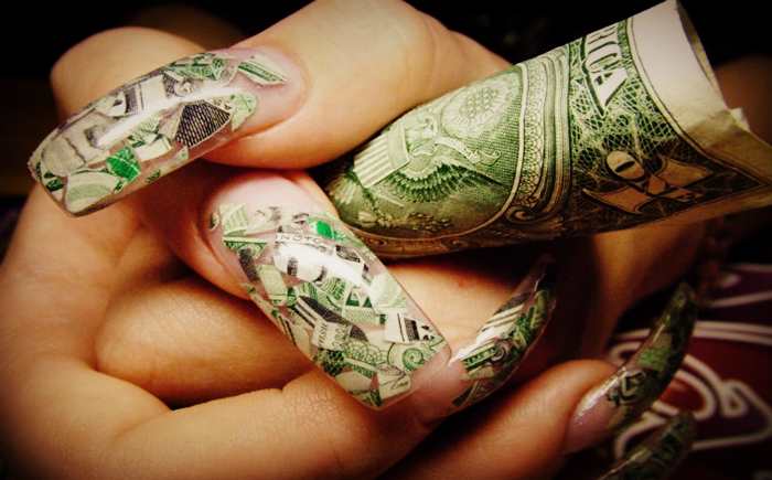 . Смотрится весьма необычно, а рисунки с изображением доллара легко найти в продаже. Такой вид маникюра идеально подходит для украшения стразами.