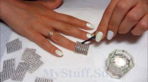 Можно также декорировать ногти еще одним оригинальным способом. Для этого на подготовленную ногтевую пластину наносится основа, которая покрывается лаком светлого оттенка. Когда все как следует высохнет, смочите ноготки водой и приложите к ним кусочки газет или вырезанные полоски текста. Затем можно покрывать все несколькими слоями закрепителя, которые надежно зафиксируют бумагу и придадут маникюру красивый блеск.