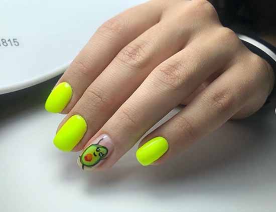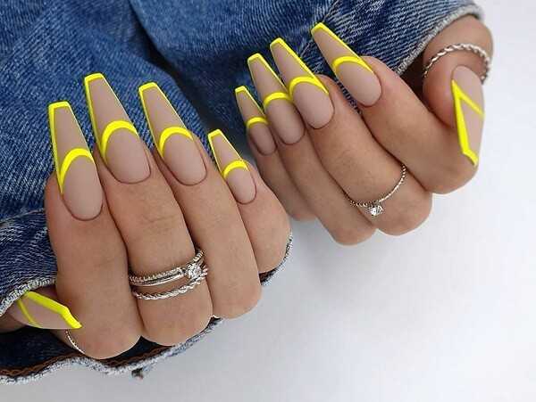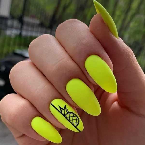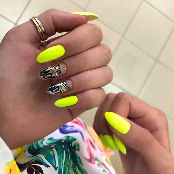 Данный оттенок делает образ ярким и насыщенным, поднимая настроение. Этот тип маникюра отлично подходит для отпуска. В то же время, для повседневного образа требуется его адаптация. Как это ни печально, неоновый желтый маникюр подходит не всем. В дизайне нужно соблюдать гармонию. Например, уместно неоновым желтым не покрывать всю поверхность ногтей, а расставить яркие акценты.
