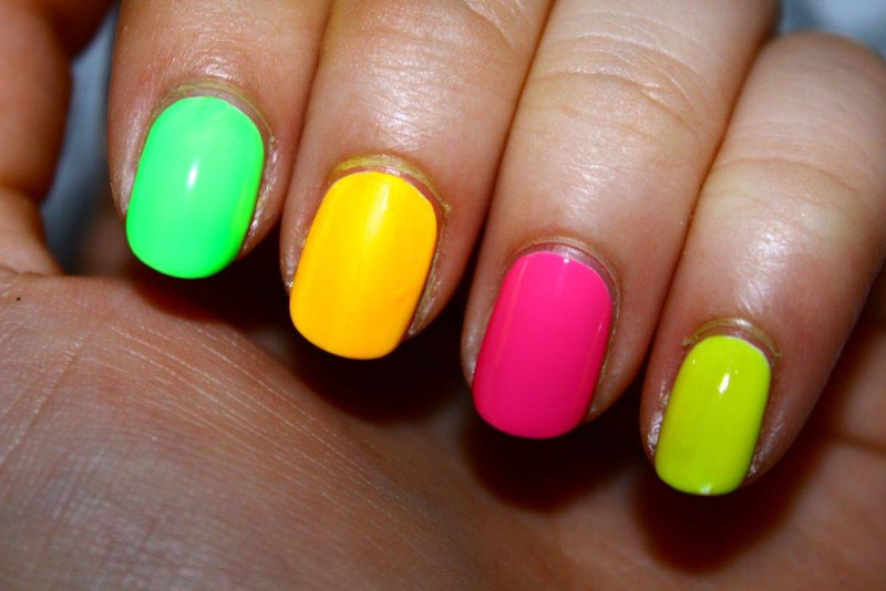 На белом фоне неоновый гель лак для ногтей выглядит ярче, чем на прозрачном. Также сейчас нэйл-мастера используют неоновые втирки. Таким образом можно все ногти сделать разноцветными.
