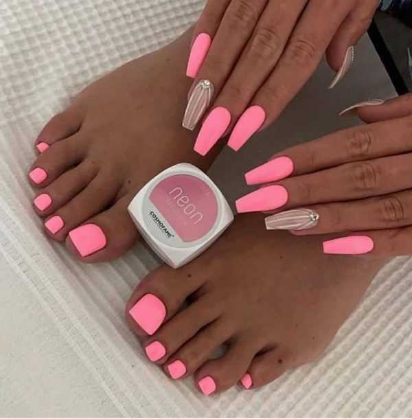Неоновый маникюр также предлагает множество вариантов дизайна. На ногтях можно создавать различные рисунки и узоры с помощью неонового лака, а также комбинировать его с другими оттенками и эффектами. Такой дизайн подойдет как для коротких, так и для длинных ногтей.
