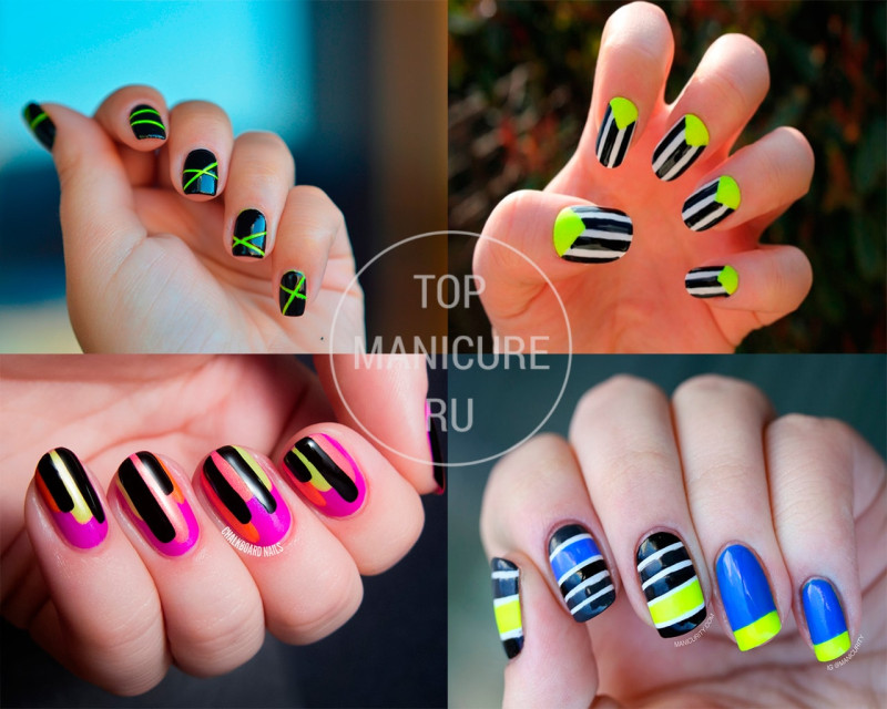 Фото 1. Для создания этого маникюра нужно покрасить ногти лаком салатового оттенка и подождать пока он высохнет. Затем на ногти накладываются кусочки ленты для дизайна. Сверху красим ногти черным цветом, а ленту удаляем. Фото 2. Здесь черно-белые линии дополняет желтый неоновый треугольник. Его можно нанести с помощью трафарета. Фото 3. В этом случае полоски нарисованы кистью. Сначала ногти покрашены неоновым фиолетовым лаком, а затем украшены желтыми, оранжевыми и черными линиями. Фото 4. Полосатый маникюр с желтым неоновым лаком идеально сочетается с френчем. Полоски делаются с помощью ленты для дизайна или рисуются.