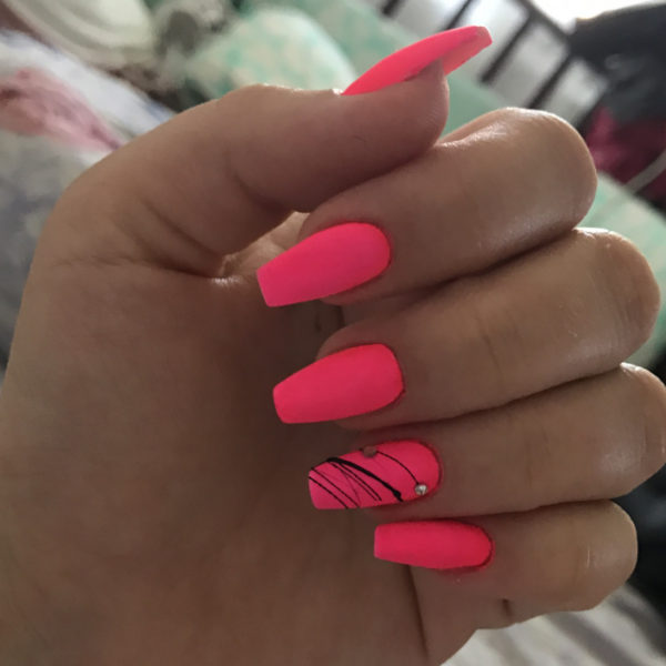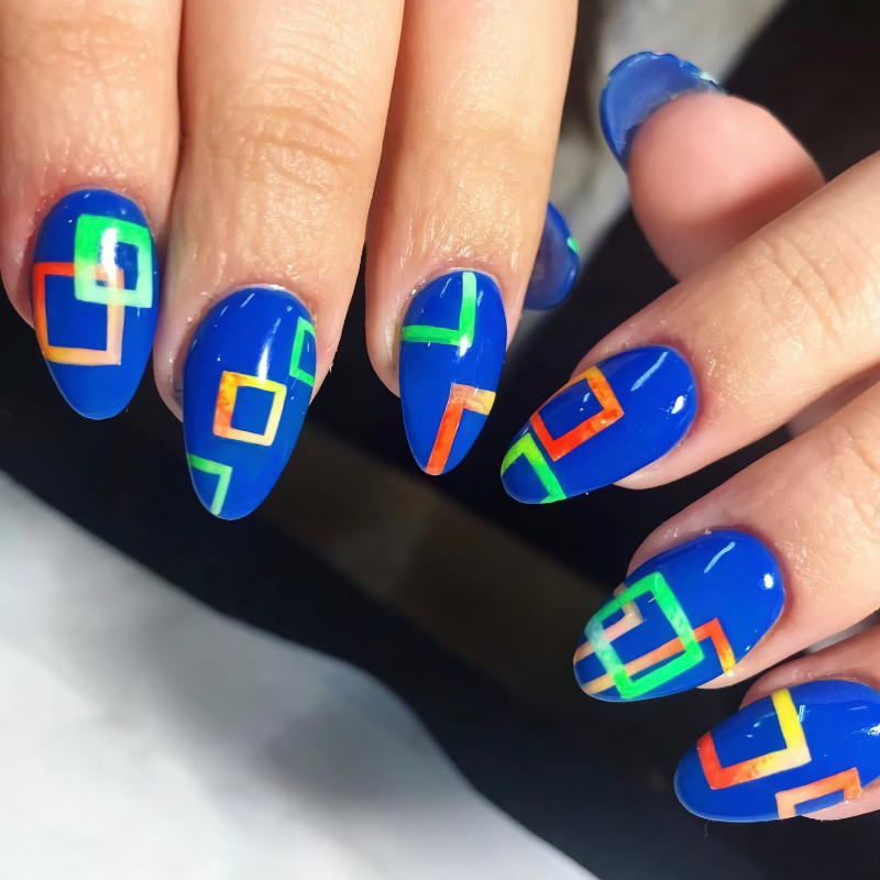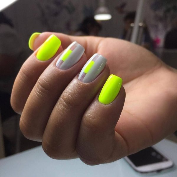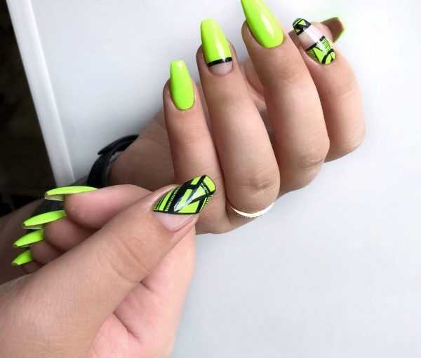 Геометрический дизайн с каждым месяцем набирает обороты популярности и принимает всё новые вариации. Ногти неоновых цветов можно украсить различными полосками, геометрическими фигурами и дополнить декоративными элементами: пайетки, стразы, камни Сваровски, маникюрные ленты, полоски. Любые переплетения и параллельные прямые будут смотреться вполне презентабельно и роскошно.