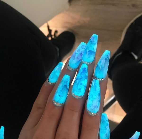 Очень эффектно будет смотреться новый в этом сезоне синий неоновый цвет, который подходит под матовый топ. Неоновый синий маникюр 2022-2023 имеет много интересных вариантов дизайна. Одним из самых трендовых дизайнов в 2022-2023 году на неоновых ногтях является «акварельные капели». На неоново-синих ногтях, узор смотрится очень красиво и загадочно.
