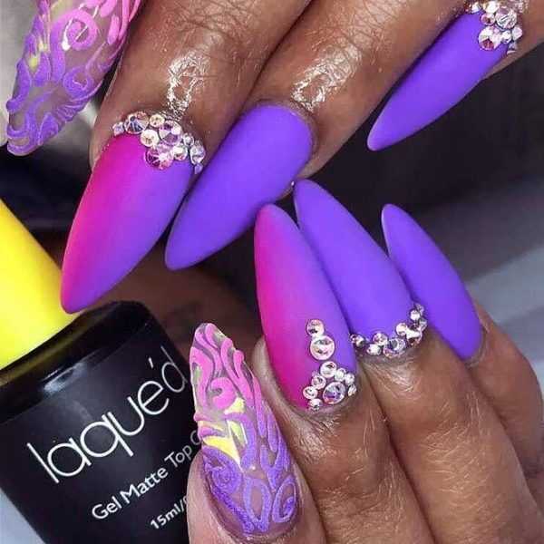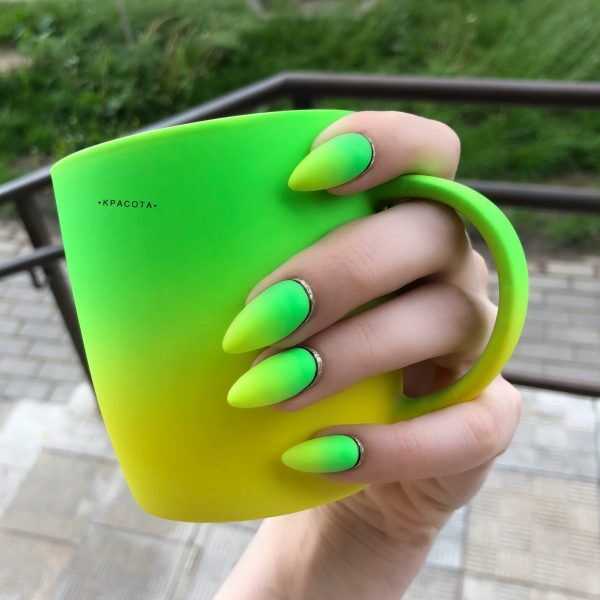 Плавный эффект перехода одного цвета в другой можно сделать с помощью неоновых лаков. Для градиента потребуются 2 или 3 кислотных оттенка. Подойдут любые неоновые гель лаки для ногтей. Подобное покрытие можно сделать с помощью кисти, спонжа или чистой кухонной губки. Нужно только нанести 2 или 3 оттенка на губку, а затем осторожными похлопывающими движениями перенести тона на ногти.
