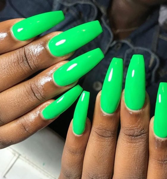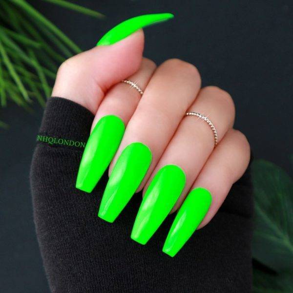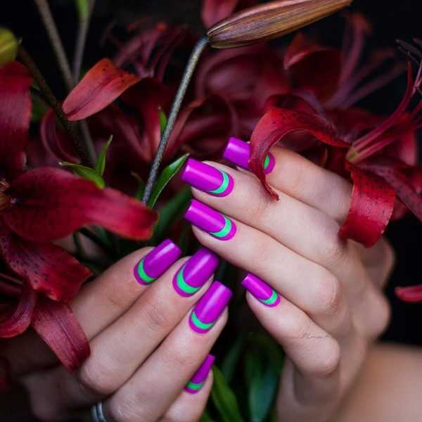 Еще одним модным летним цветом считается зеленый. Такой оттенок цвета, оставаясь красочным и ярким, освежает образ и выглядит более сдержанно. Неоновый маникюр в зеленом цвете лучше всего украшать рисунками или трафаретами. Зеленый цвет прекрасно сочетается в абстрактном рисунке с желтым, малиновым или оранжевым цветом. Любому летнему образу подойдет кислотный яркий зеленый маникюр. При этом если вы выберете минималистичный маникюр с полосками неонового зеленого цвета, вы сможете сочетать его и со строгим дресс-кодом.