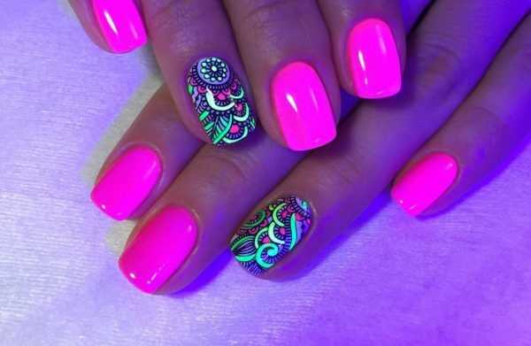 Все яркие оттенки роскошно светятся под лучами неоновой лампы и понравятся девушкам-подросткам, которые любят ночные дискотеки, вечеринки. Это прекрасный вариант для отпускного летнего маникюра. На пляже возле моря с таким дизайном ногтей вы будете выглядеть вполне уместно.