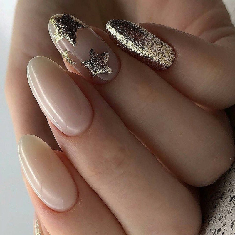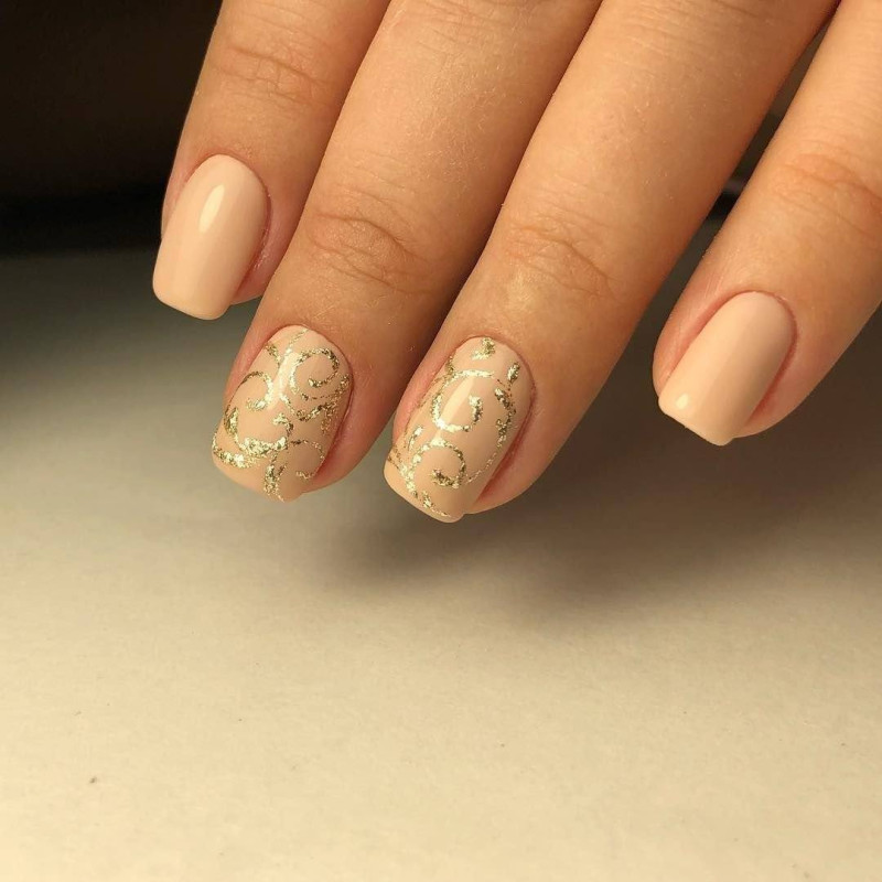 Нюдовые оттенки великолепно сочетаются с золотым декором. При этом маникюр не будет выглядеть слишком заметно и вызывающе. Все дело в схожей цветовой палитре, что позволяет создать удивительно красивые и визуально нежные нейл-арты.