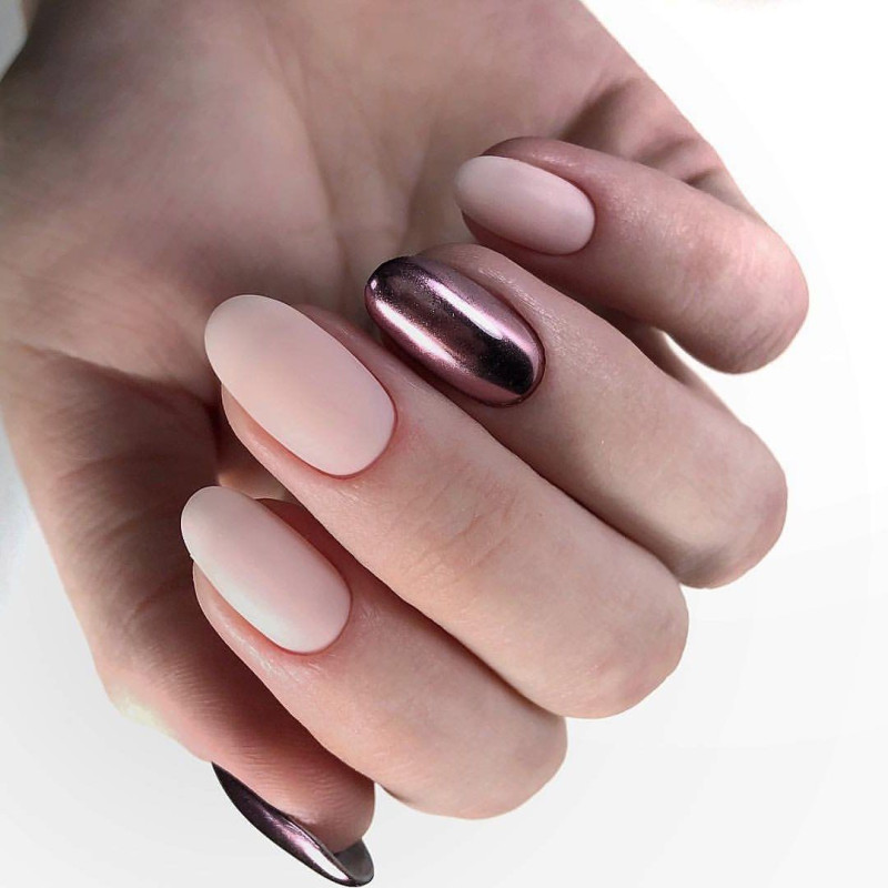 Металлическая зеркальная втирка станет прекрасным дополнением. Ей выделяют один-два ногтя, либо заполировывают весь маникюр. Особенно эффектно будет смотреться под матовым покрытием.