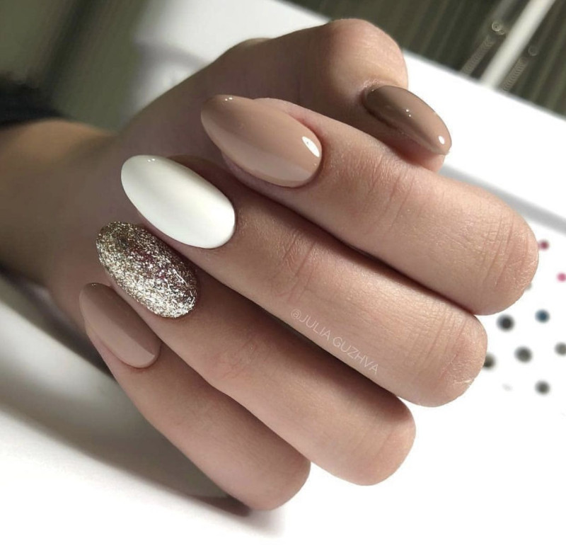 Оттенок лака чуть-чуть светлее вашего оттенка кожи, но при этом сильного контраста нет. микс различных оттенков. Вовсе не обязательно использовать только один оттенок при покрытии. Вы можете подобрать несколько оттенков и наносить их поочередно или хаотически. При таком нанесении можно использовать до 5 различных оттенков. Отлично сочетаются оттенки розового и коричневого. нюд камуфляж. Еще один способ сделать очень мягкий акцент на своих руках. Используем оттенки розового, хаки и коричневого. мокка и золото. Необычный вариант покрытия, который смотрится празднично и нарядно, но при этом не утрачивает своей сдержанности и элегантности. Основа такого маникюра — это, конечно, мокка. Золото добавляем совсем немного золота на кончиках ногтей. При таком сочетании вам может и не понадобятся дополнительные украшения на руки или пальцы. Одного кольца вполне достаточно, чтобы получить прекрасный и завершенный образ. нюд и лаванда. Еще один интересный вариант для покрытия, если хочется чего-нибудь оригинального. Сам по себе лавандовый оттенок довольно яркий, даже если взять самые приглушенные оттенки. А вот добавить немного лаванды к бежевому нюду — это идеально. Можно сделать любой небольшой лавандовый акцент на ногтях. нюд и минимализм. Тренд этого сезона — простота и лаконичность. Если уж добавляете узоры и геометрические фигуры, то не переусердствуйте. Всего должно быть в меру
