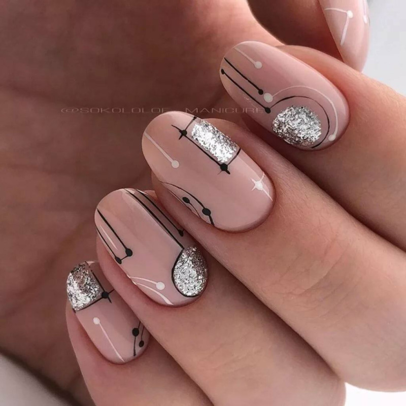 Нюд и лак с блестками. Это самый простой способ добавить немного гламура в ваш образ, особенно, если вы еще новичок. За основу берем любой оттенок нюда, который вам больше всего нравится. Как только основа высохнет, можно наносить лак с блестками. Здесь вы можете сами придумать способ нанесения — можно нанести на кончики ногтей, можно на пластину. А если хочется лаконичного маникюра, то можно нарисовать аккуратные вертикальные или горизонтальные полосы. Вам нужно будет нанести несколько слоев такого лака. Для лучшего эффекта можно нанести и 3 слоя. Если уж вы взялись за узоры, то попробуйте с простых геометрических полос. Как это сделать: