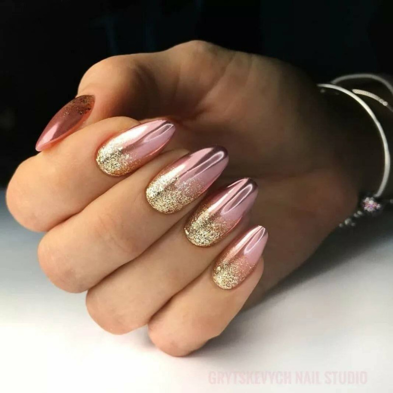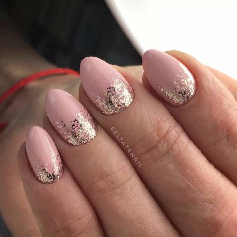 На короткой форме миндаля выбирайте упрощенный дизайн с минимумом рисунков. Однако применение глиттера с разными размерами его частиц сделает образ женственным и утонченным.