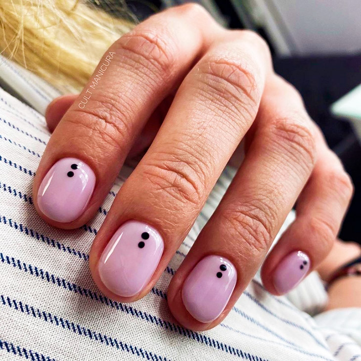 Маникюр с точками или в горошек подойдет под любой случай. Такие акценты стоит расставлять в классической связке чёрно-белого. Точки рисуют по середине.