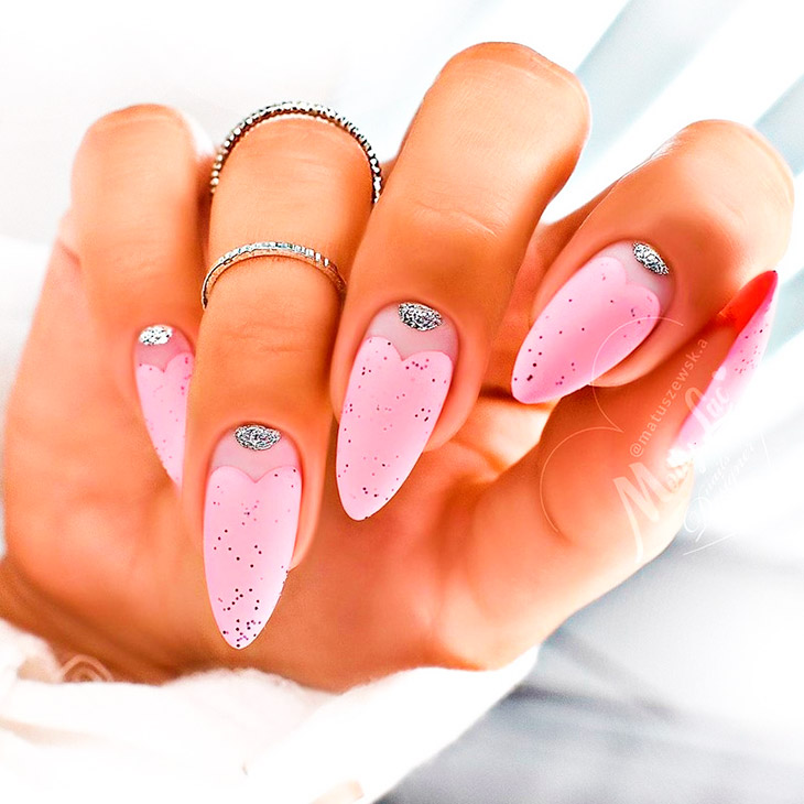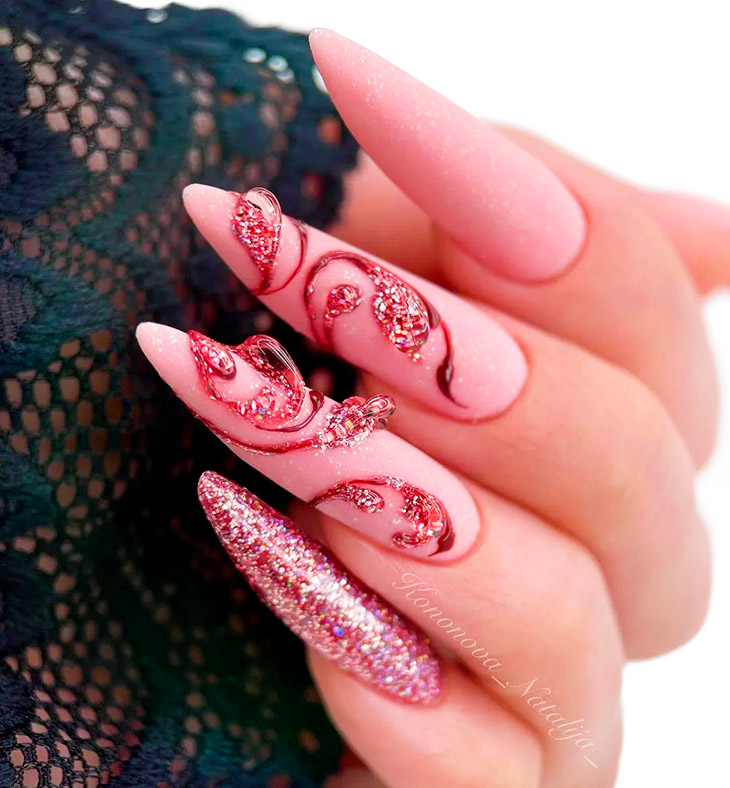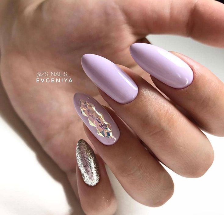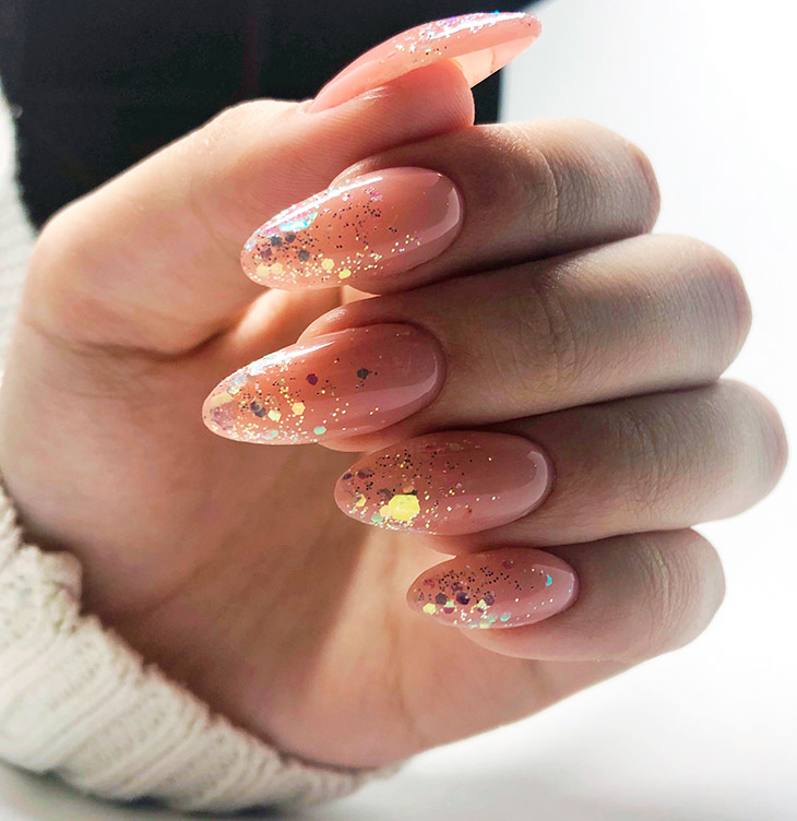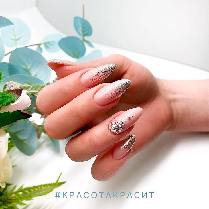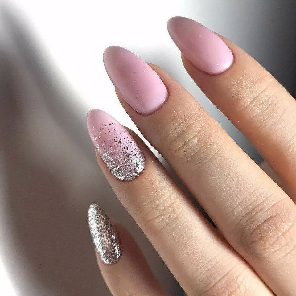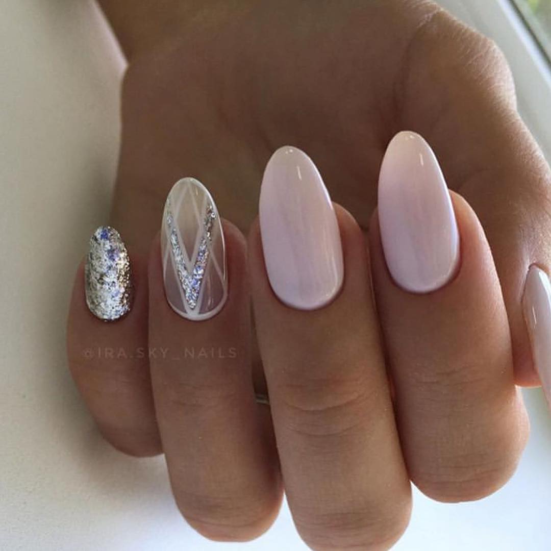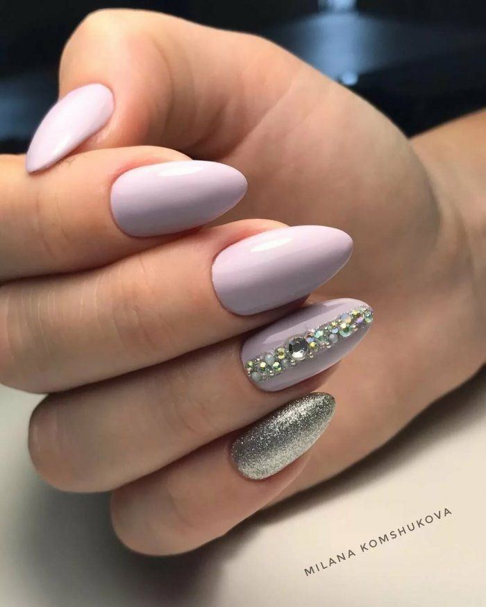 На короткой форме миндаля выбирайте упрощенный дизайн с минимумом рисунков. Однако применение глиттера с разными размерами его частиц сделает образ женственным и утонченным.