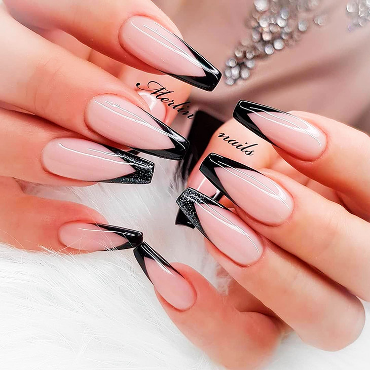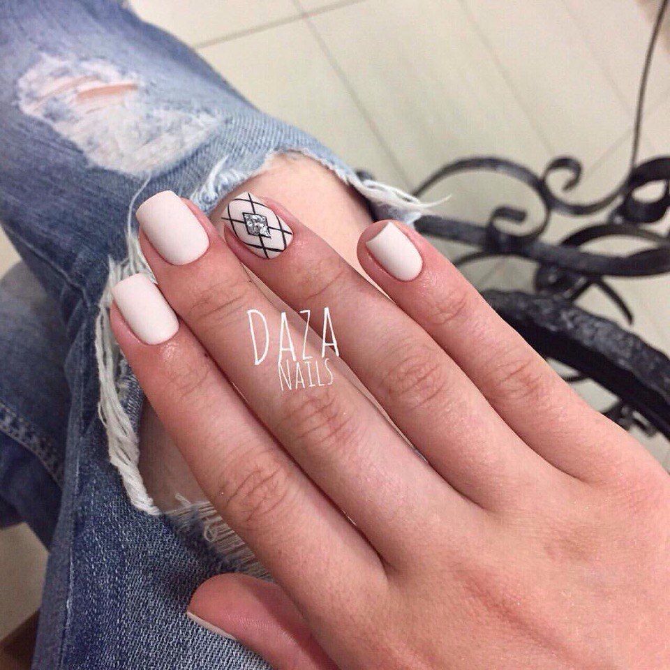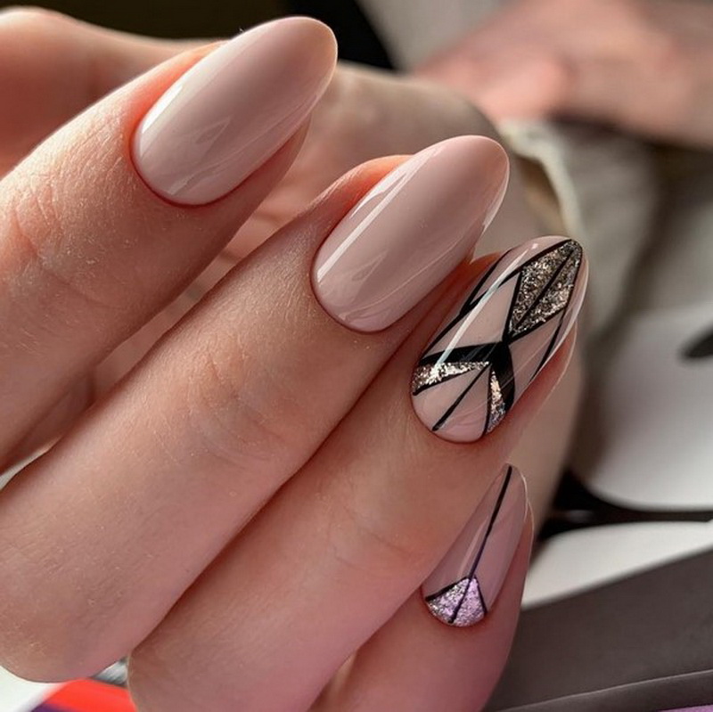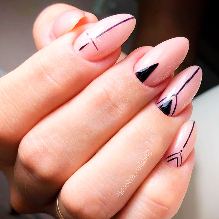 Нюд — это естественность, поэтому в геометрическом дизайне стоит выбирать простые прямые линии, треугольники или лаконичные точки. В геометрии стоит использовать чёрный лак, чтобы «сыграть» на контрасте.