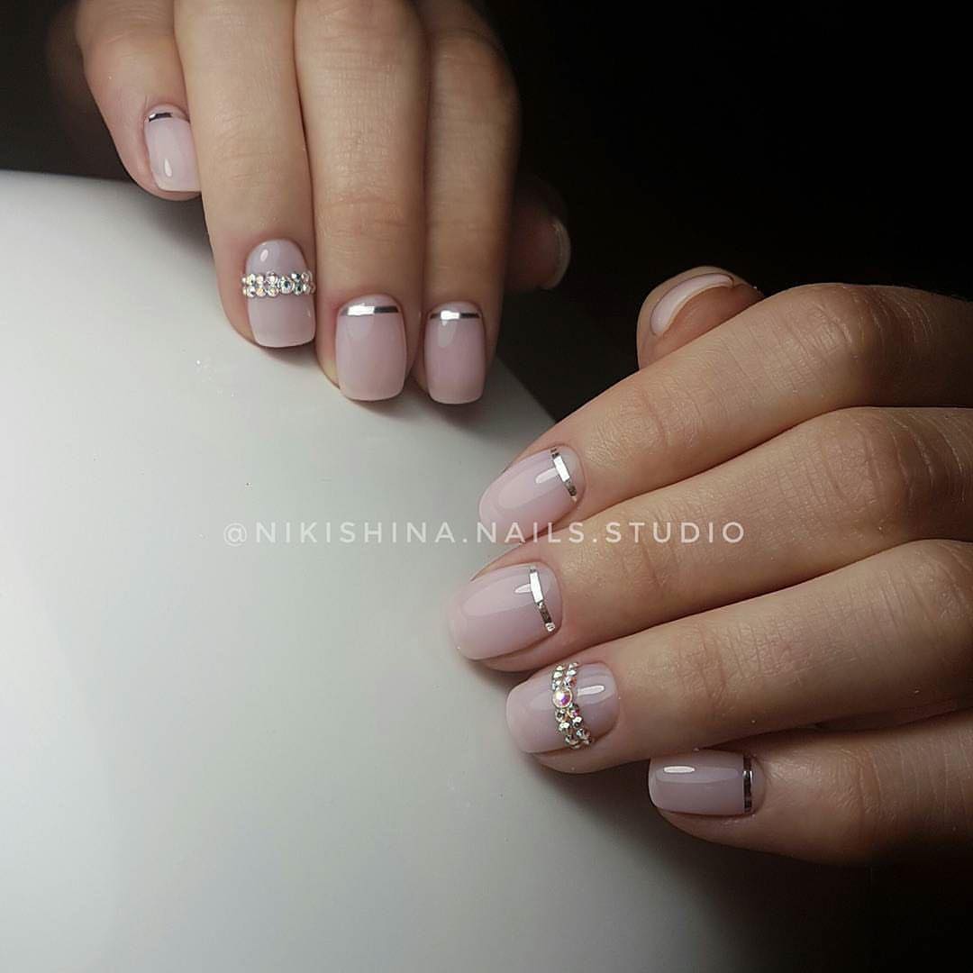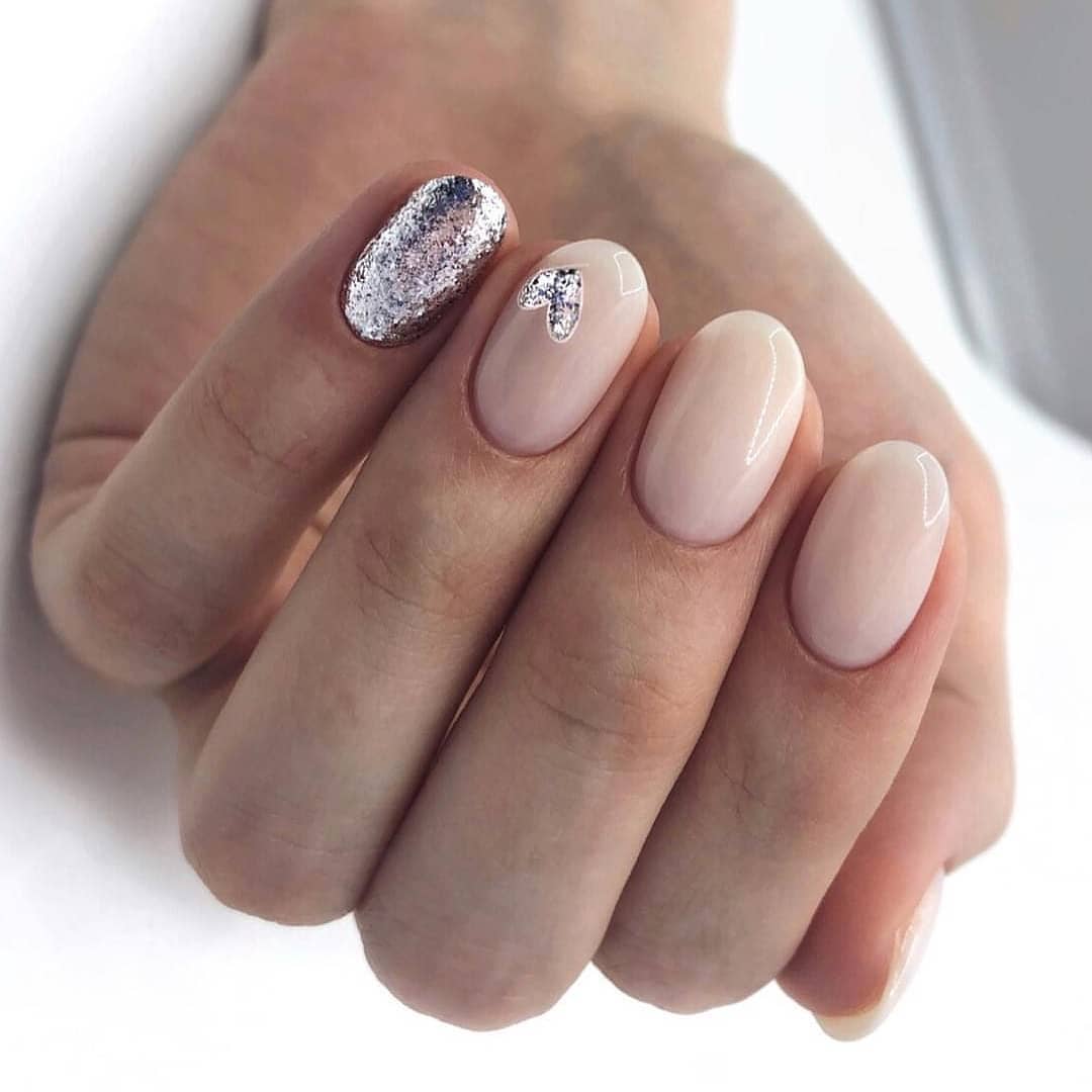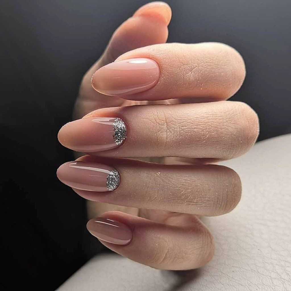 Нюдовый маникюр с интересно расставленными блестящими элементами несомненно привлечет внимание, подойдет на свадьбу, минималистическом стиле