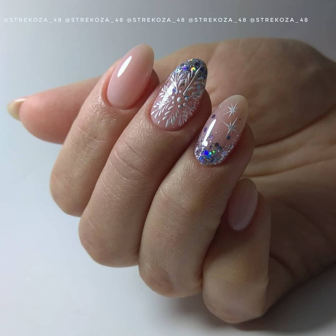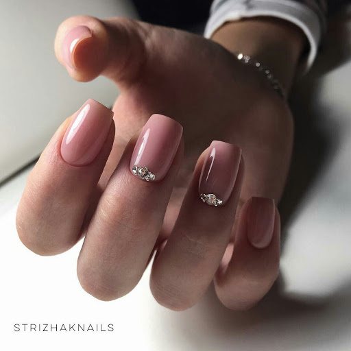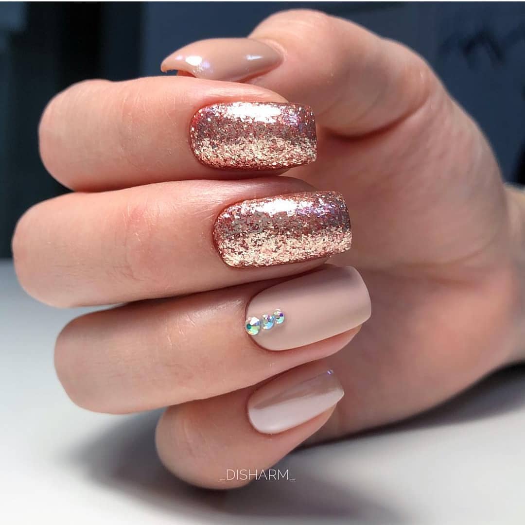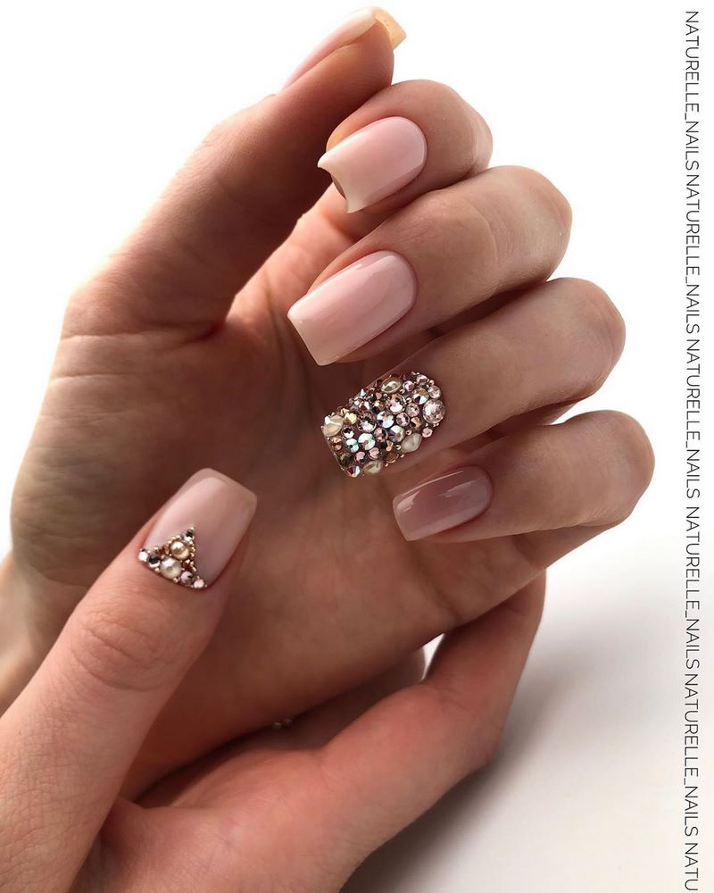 Нюдовый маникюр с интересно расставленными блестящими элементами несомненно привлечет внимание, подойдет на свадьбу, минималистическом стиле