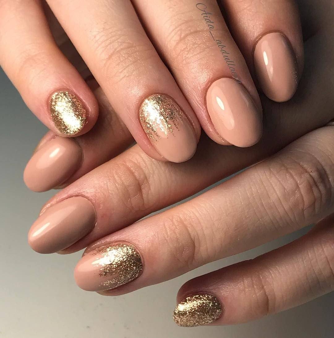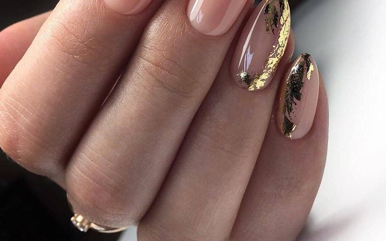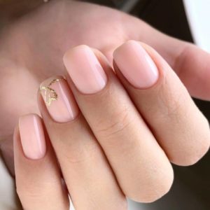 Нюдовые оттенки великолепно сочетаются с золотым декором. При этом маникюр не будет выглядеть слишком заметно и вызывающе. Все дело в схожей цветовой палитре, что позволяет создать удивительно красивые и визуально нежные нейл-арты.
