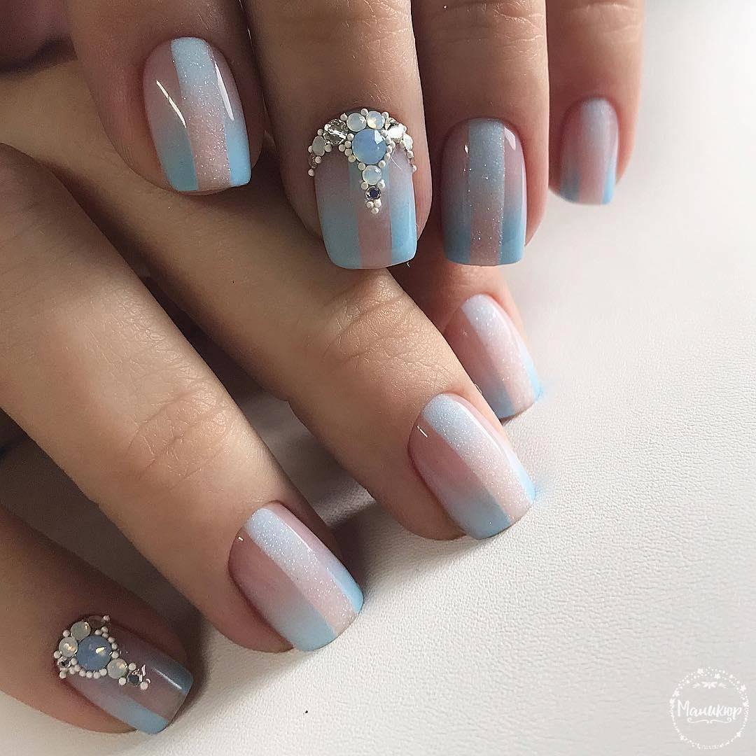 Весьма эффектно будет смотреться плавный переход омбре от тёмного к светлому. Создастся эффект замерзших кончиков, что подойдет как на длинные, так и на короткие ноготки. Интересным решением градиента будет обратный эффект — от светлого к тёмным кончикам.