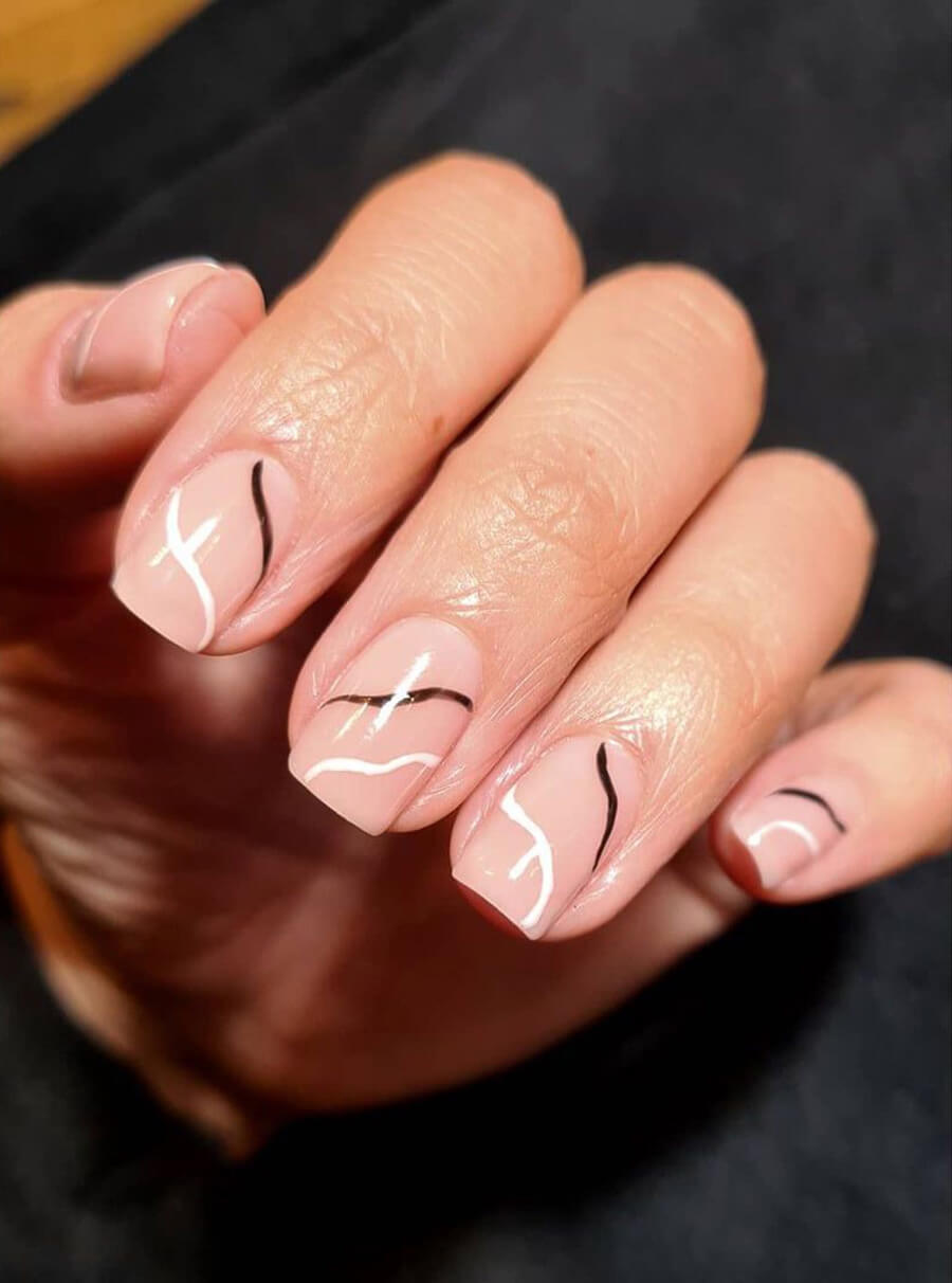 Палитра nude выглядит исключительно нежно на коротких ногтевых пластинах. Также, если вы предпочитаете более интересные вариации дизайна, вы всегда можете украсить ногти рисунками. Изображения наносятся на поверхность ногтей в технике художественной росписи или стемпинга. В качестве альтернативы вы также можете использовать готовые стикеры или слайдеры с разными изображениями. На короткие голые ногти чудесно подойдут аккуратные бутоны и веточки, композиции из геометрических фигур в графическом стиле или колор блок. А также всевозможные полосы, точки и абстрактные сцены в виде мазков или линий и многие другие примеры.