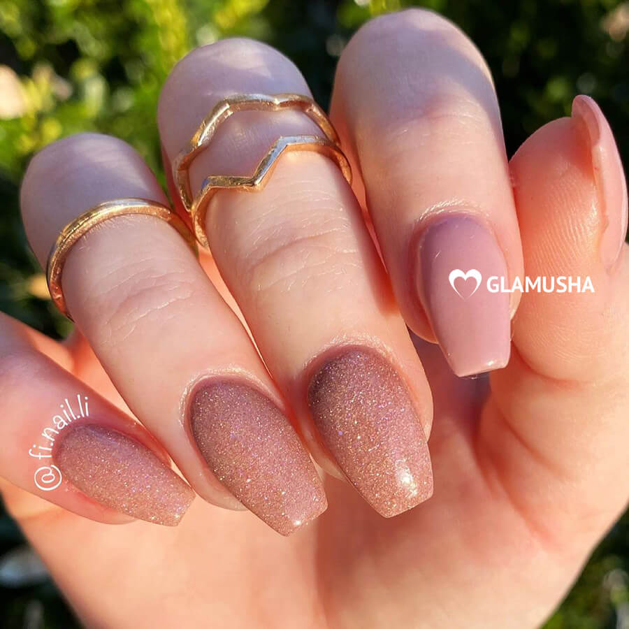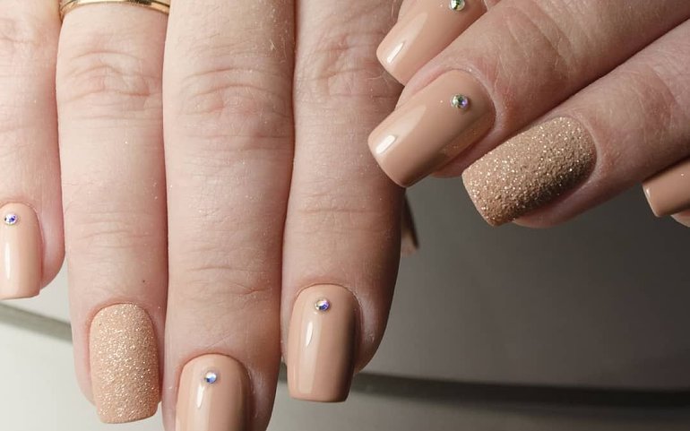 На нюдовом фоне красиво выглядит растяжка блестками, дизайн с геометрией, флористикой. Под блестящий декор обычно выделяется 1-2 ноготка, остальные же покрываются однотонным нюдовым оттенком. В однотонном исполнении красиво выглядит кофейный, серый, бежевый, молочный цвета. При этом можно без опасений использовать золотой глиттер. В сочетании с нюдовыми тонами он будет смотреться сдержаннее и мягче.
