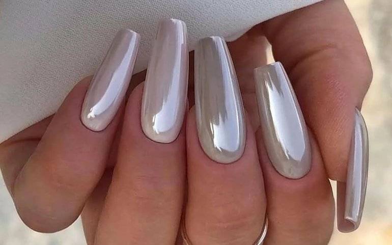 Металлическая зеркальная втирка станет прекрасным дополнением. Ей выделяют один-два ногтя, либо заполировывают весь маникюр. Особенно эффектно будет смотреться под матовым покрытием.