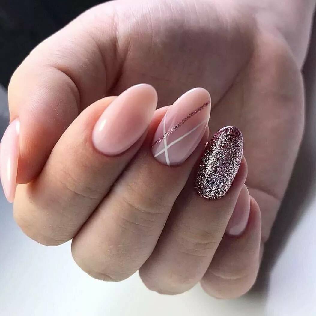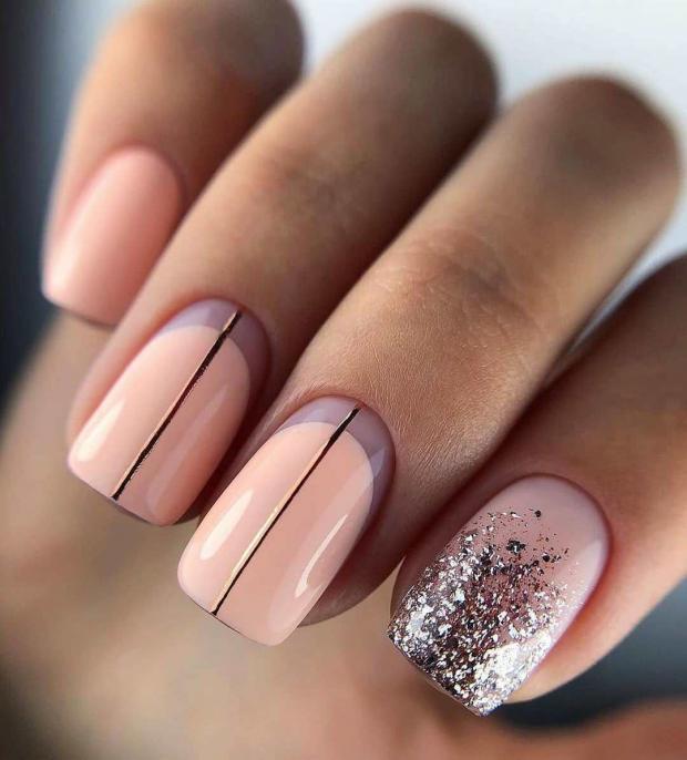 Нюд и лак с блестками. Это самый простой способ добавить немного гламура в ваш образ, особенно, если вы еще новичок. За основу берем любой оттенок нюда, который вам больше всего нравится. Как только основа высохнет, можно наносить лак с блестками. Здесь вы можете сами придумать способ нанесения — можно нанести на кончики ногтей, можно на пластину. А если хочется лаконичного маникюра, то можно нарисовать аккуратные вертикальные или горизонтальные полосы. Вам нужно будет нанести несколько слоев такого лака. Для лучшего эффекта можно нанести и 3 слоя. Если уж вы взялись за узоры, то попробуйте с простых геометрических полос. Как это сделать: