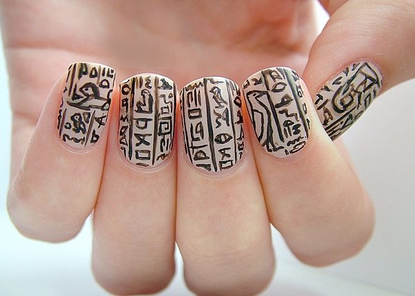 Для эмоциональных и активных женщин отлично подходит маникюр с изображениями египетских иероглифов. Золотистые или серебряные знаки интересно смотрятся на темной основе.