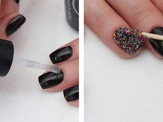 Каждый ноготок покрывают бесцветным лаком и, обмакивая зубочистку в емкость с бусинками, наносят их на пластину.