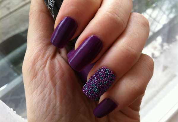 - Икорный маникюр выполняется с помощью небольшого по размеру бисера, который также имеет название бульонки. Это крохотные шарики в одной цветовой гамме или разноцветные. Основой для маникюра станет лак насыщенного оттенка.