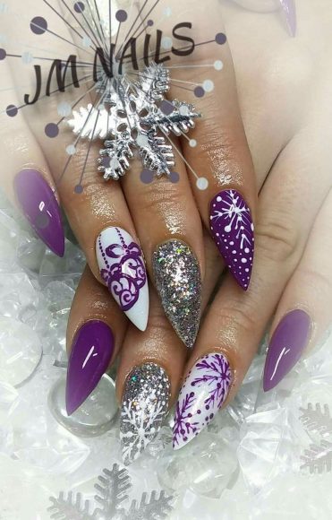 Художественный нейл-арт. Рисунки на ногтях никак не выйдут из моды, а какая зима и Новый год без снежинок? И хотя это уже далеко не новшество, но в декабре-январе такие узоры являются самыми востребованными. Основной тон может быть самым разным, преимущественно темным, на котором белоснежные или серебряные снежинки смотрятся просто волшебно.