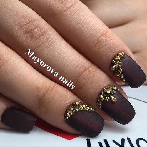 Золотистые стразы и бульонки на матовом лаке