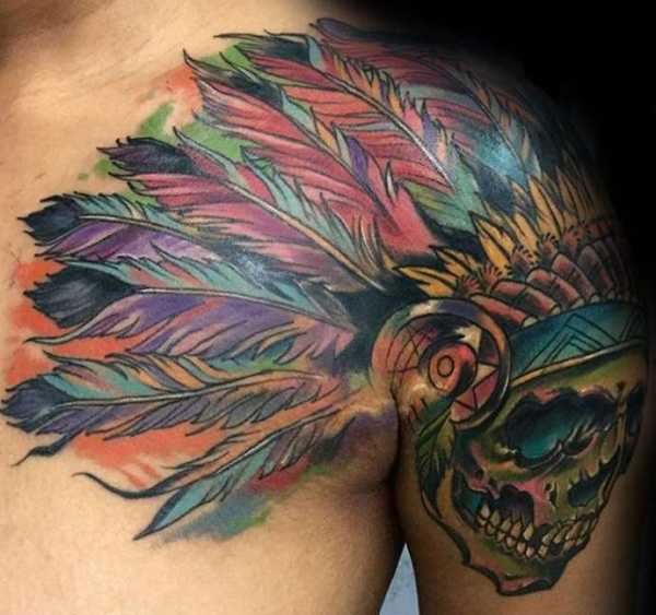 Благодаря характерным головным уборам индейцев, которые выполнены из перьев и являются своего рода визитной карточкой всей этой культуры, татуировка приобретает ещё большую привлекательность. Тату индейца, выполненная в цвете будет очень яркой и насыщенной.