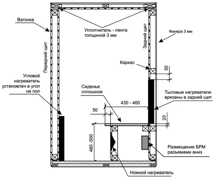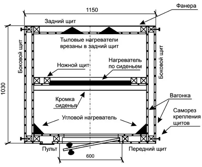 Конструктивно ИК-сауна – это кабинка из натурального дерева, с установленными внутри специальными нагревателями. Габариты кабинки зависят от предполагаемого количества мест. Минимальный размер – 1 м в ширину и 1 – 1,5 м в высоту. Кабина сконструирована из расчета, что человек в ней располагается сидя на скамейке.
