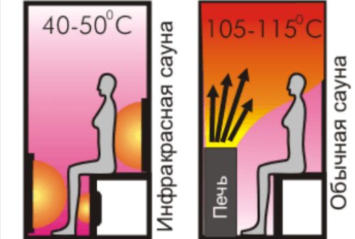 Главное отличие ИК-сауны от русской бани и электросауны – внутренняя температура и принцип разогрева.