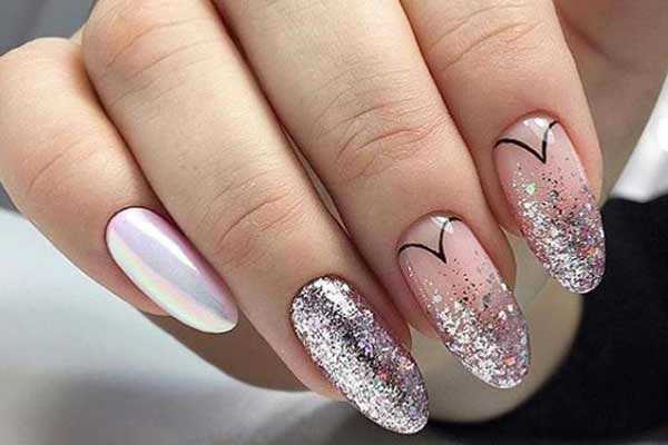 Безусловно, самая популярная форма блесток для маникюра — круглая. Если вам удобнее использовать блестящую краску или рассыпчатые пайетки, все же можно найти вариант с блестящими частицами такой формы. С их помощью, кстати, можно оставлять на ногтях важные сообщения — посмотрите пример в нашей подборке фото.