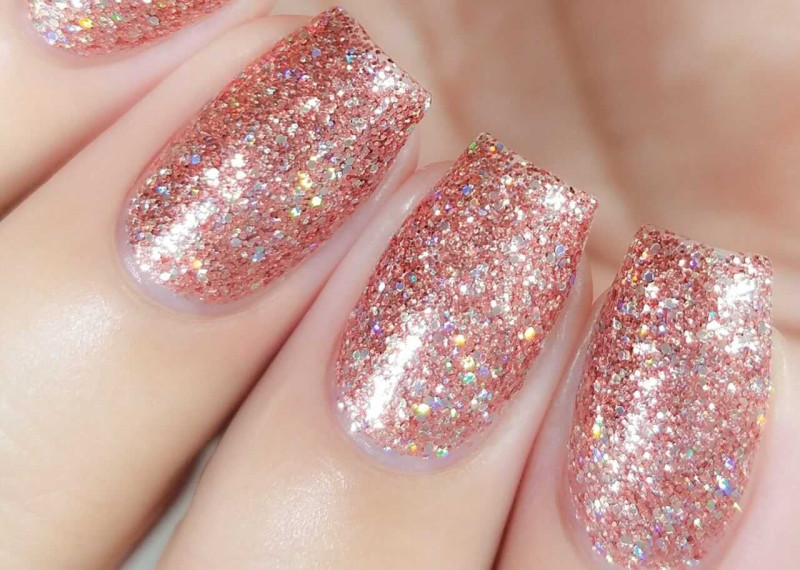 Глиттер является родной сестрой шиммера, но вместо крохотных частиц содержит небольшие блёстки. Подобное дополнение может быть однотонным и цветным, иметь форму круга, прямоугольника, треугольника, сердечек, звёздочек. Снимать с ногтей его тоже проблематично.