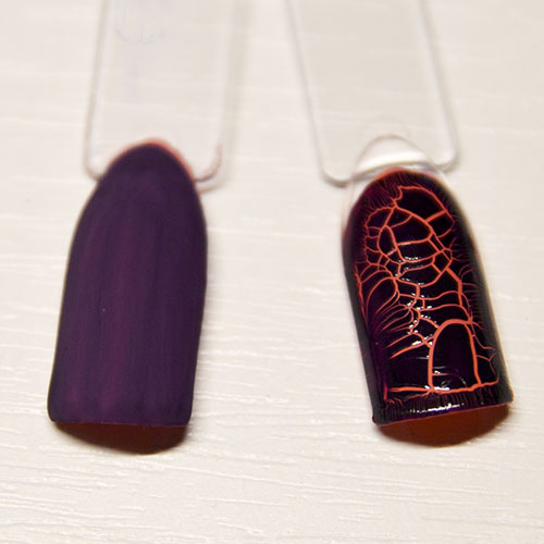 В первом случае на пластине образуется довольно тонкая сеточка из трещинок, а сквозь них практически не видна основа. Во втором случае кракелюр на ногтях заметен более выраженно: трещины имеют большее пространство между собой, и можно рассмотреть оттенок базового цвета.