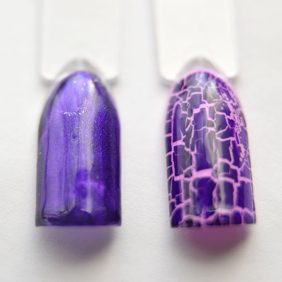 В первом случае на пластине образуется довольно тонкая сеточка из трещинок, а сквозь них практически не видна основа. Во втором случае кракелюр на ногтях заметен более выраженно: трещины имеют большее пространство между собой, и можно рассмотреть оттенок базового цвета.