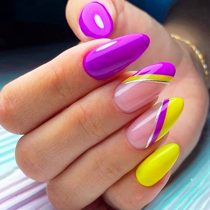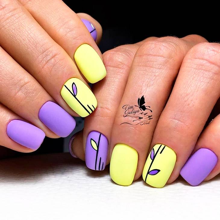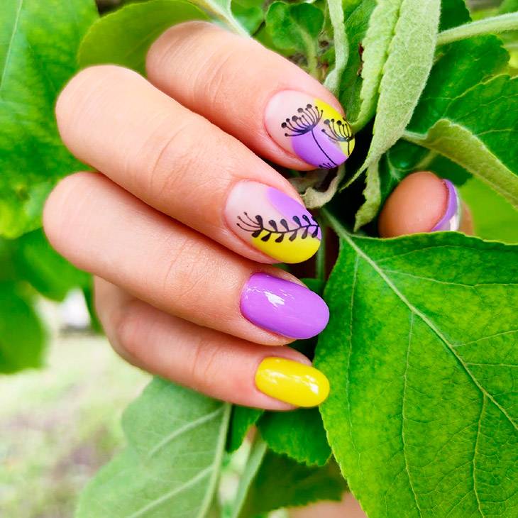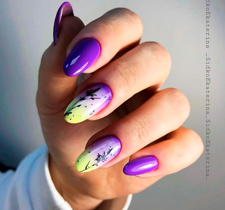 Фиолетовый и желтый цвет — выразительное и живое сочетание. Желтый можно использовать для акцентов или создания рисунков вместе с фиолетовыми оттенками, что добавит яркость и солнечность к вашему маникюру.