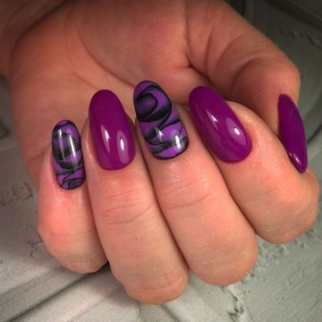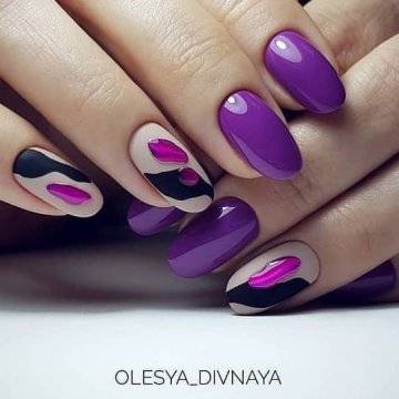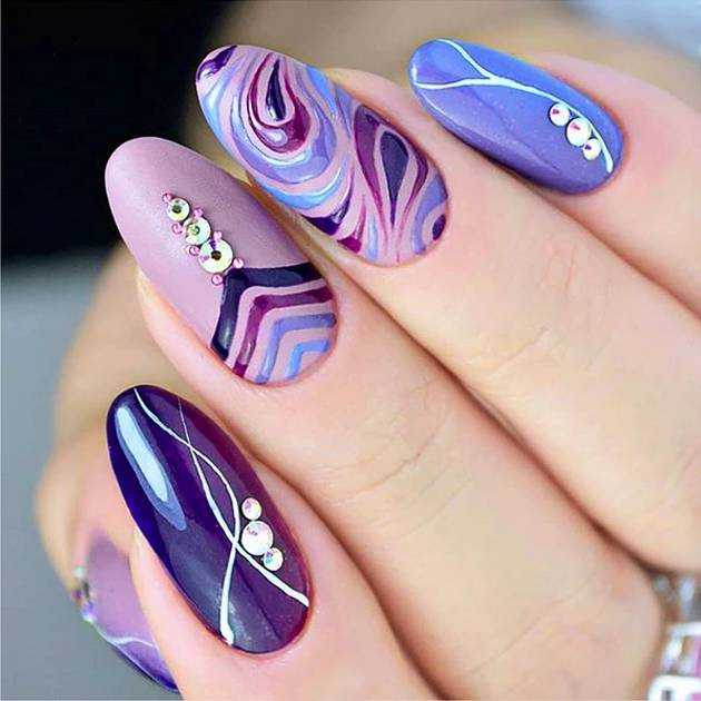 Уникальной идеей для фиолетового цвета станет водный маникюр, идея с абстрактными решениями и классический лунный френч можно сделать с помощью сиреневого и баклажаного оттенков.