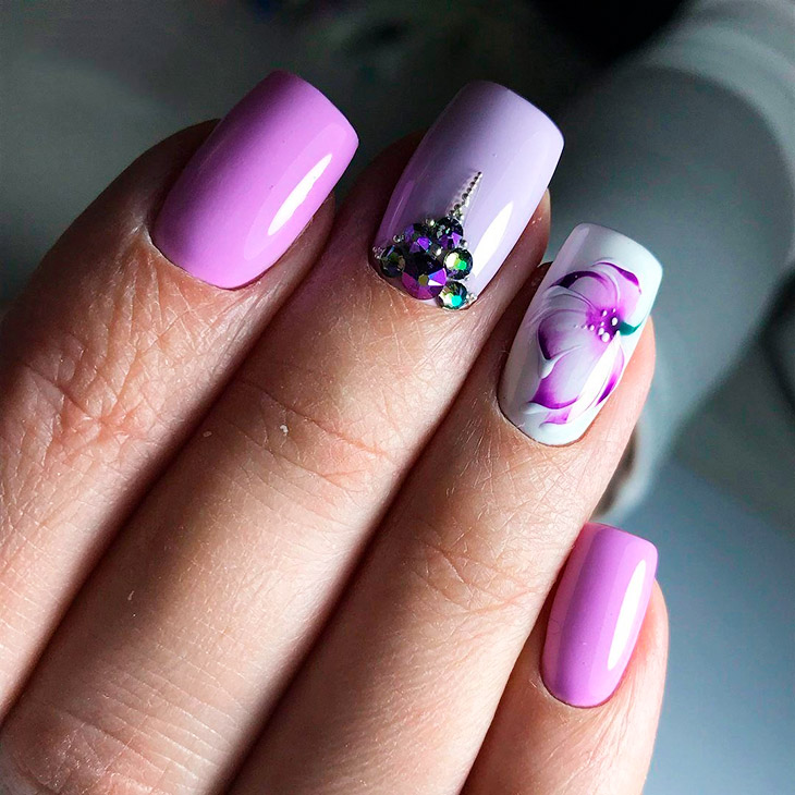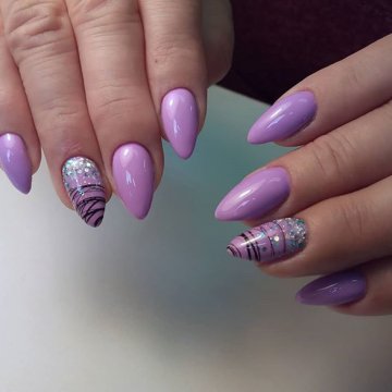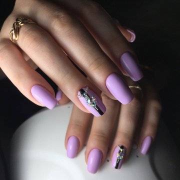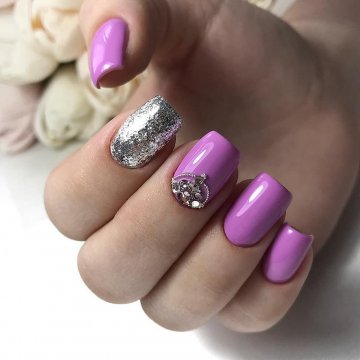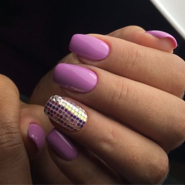 Стразы и блестки используются при создании сиреневого маникюра достаточно часто. Важную роль играет соблюдение меры. Россыпи страз следует использовать при декоре отдельных ногтей. Они могут применяться также в качестве дополнения к лепке, литью, росписи.