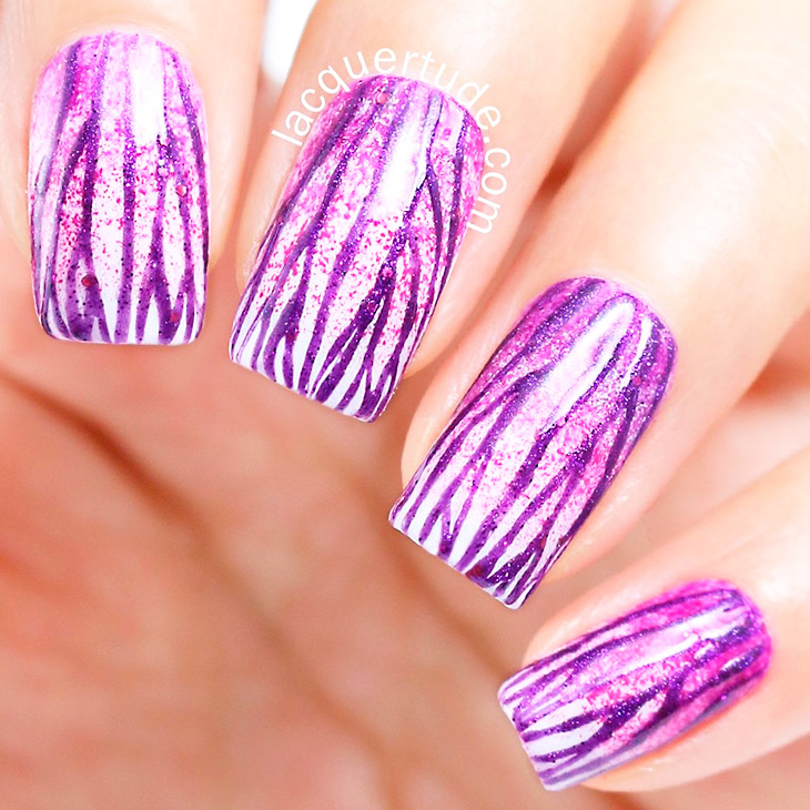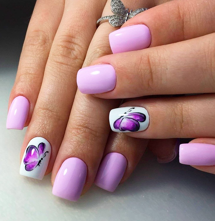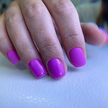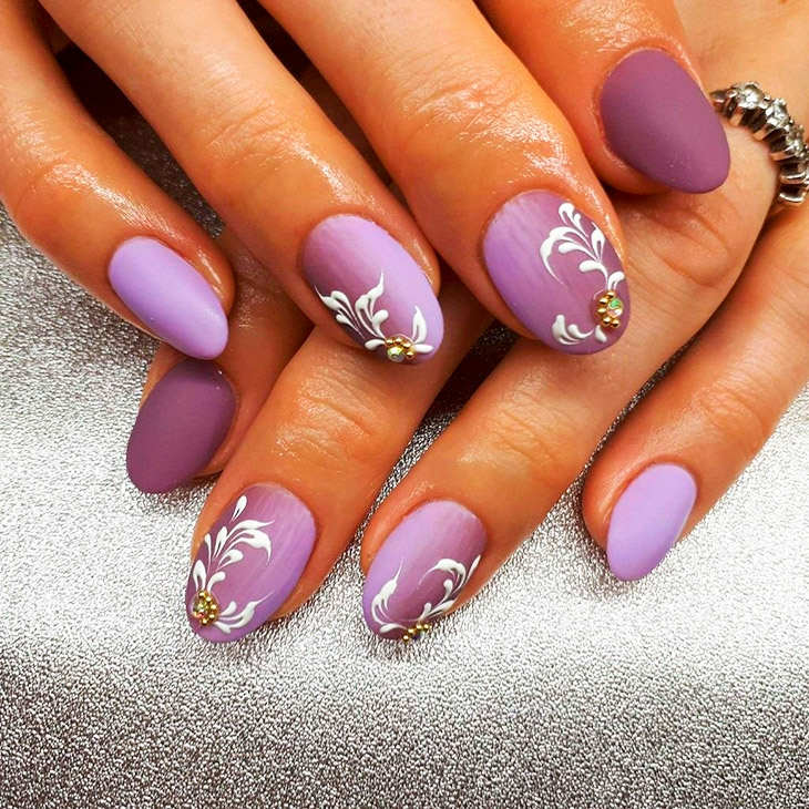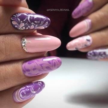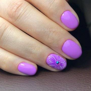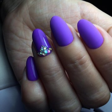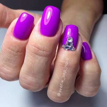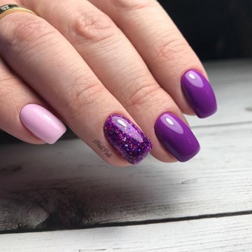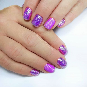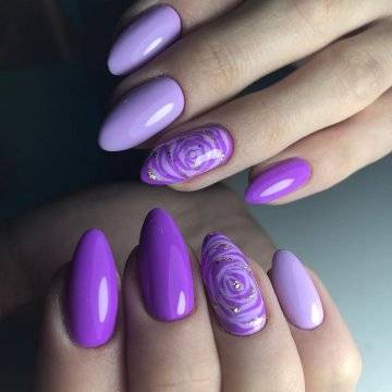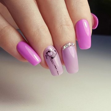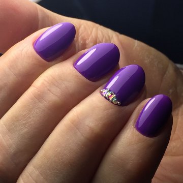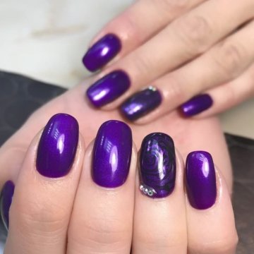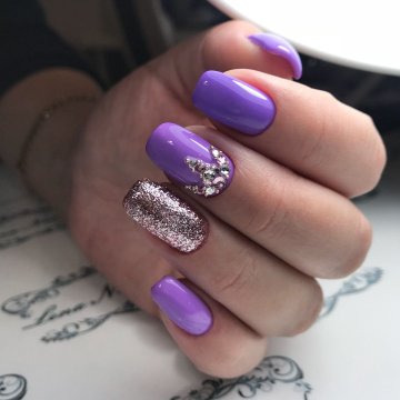 Используя яркий фиолетовый оттенок на нечетных пальцах и нежный лавандовый на четных можно сделать прекрасный вариант для вечернего образа, украсив короткие ногти у основания небольшими узорами или стразами.