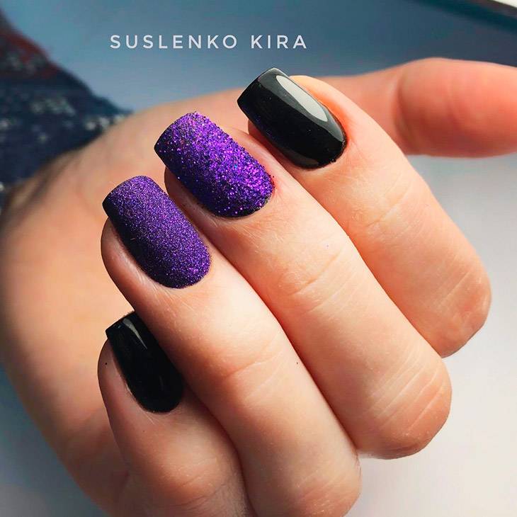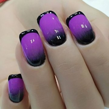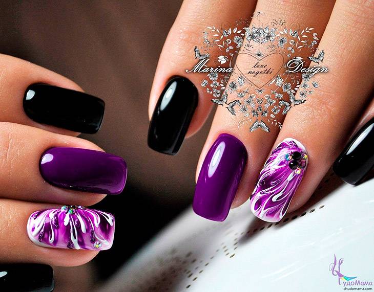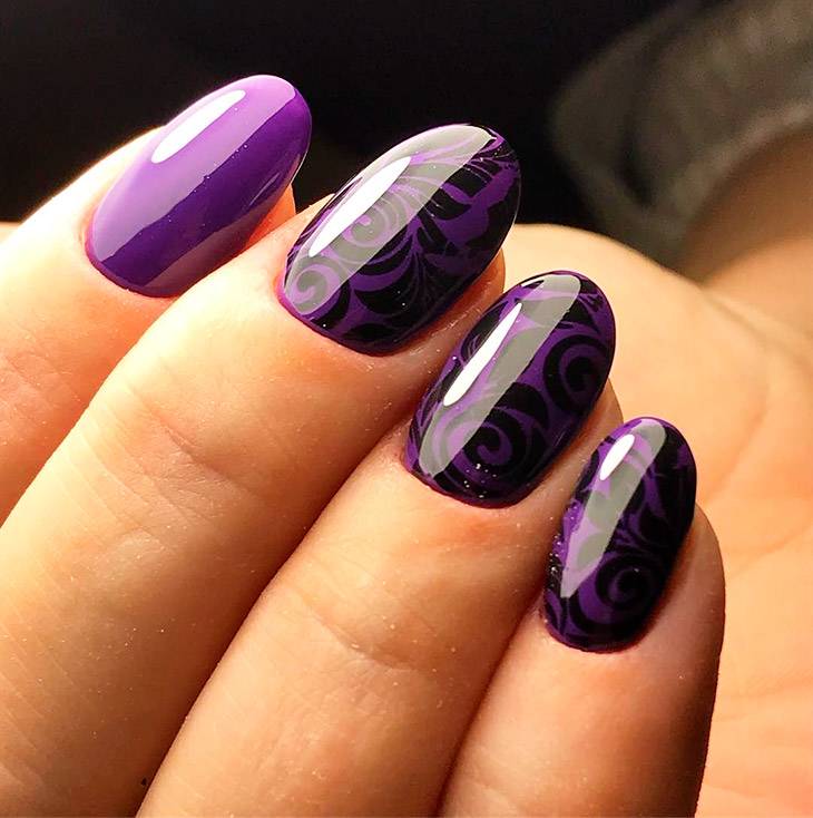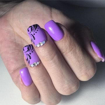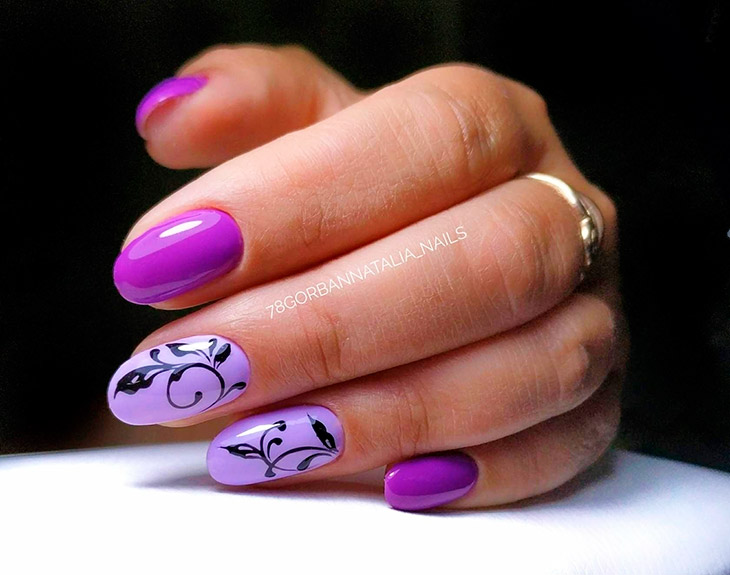 Этот цвет больше подходит для темно-сиреневого оттенка, особенно в виде градиента. Однако использовать его можно и на светлых тонах: украшением дизайна станут черные полоски или геометрические узоры, надписи, а также цветочные рисунки. Дополнительно используют фольгу, камифубуки и стразы. Наиболее подходящим будет глянцевое покрытие.